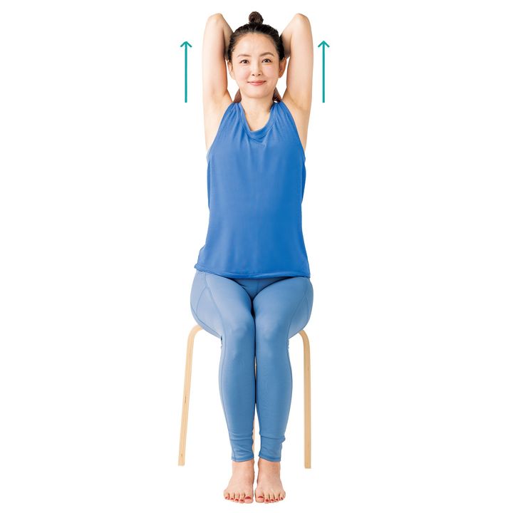 ②耳を挟んで肘が顔の前を通るように動かしながら、できるだけ高く真上に上げる。