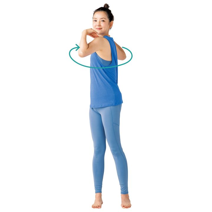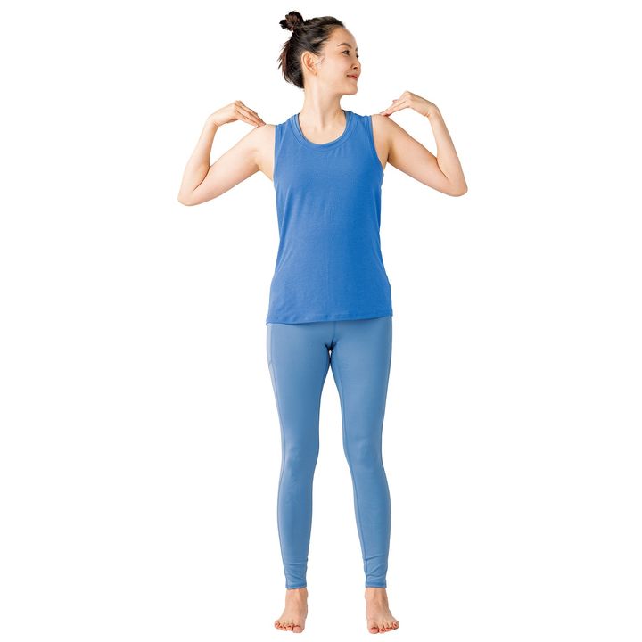 ①足を肩幅くらいに開いて立つ。胸を張って腕を外側に開き左右の手の先を肩先につけ、顔を左に向ける。