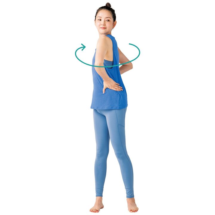 ①足を肩幅くらいに開いて立つ。両手を肋骨近くの脇腹に置く。親指が前方、他の指が後方にくるように。顔を左に向ける。