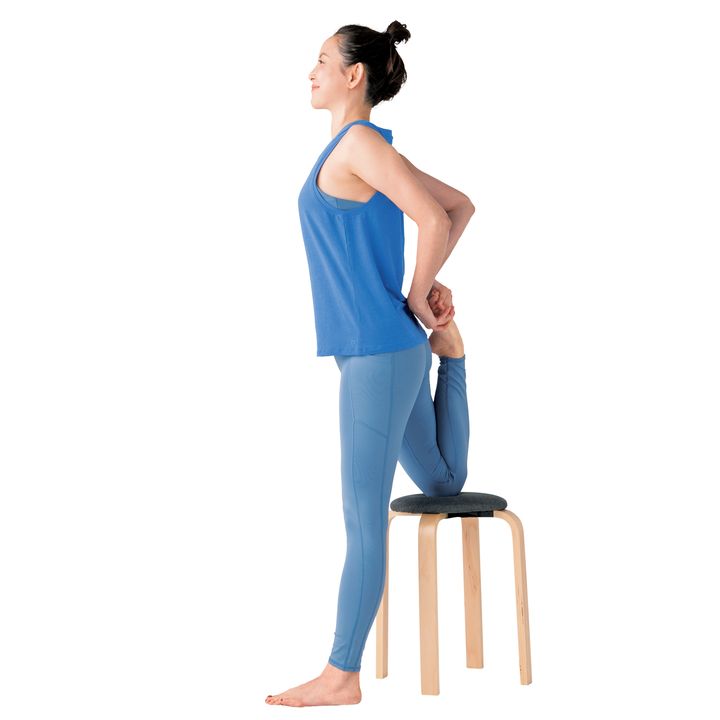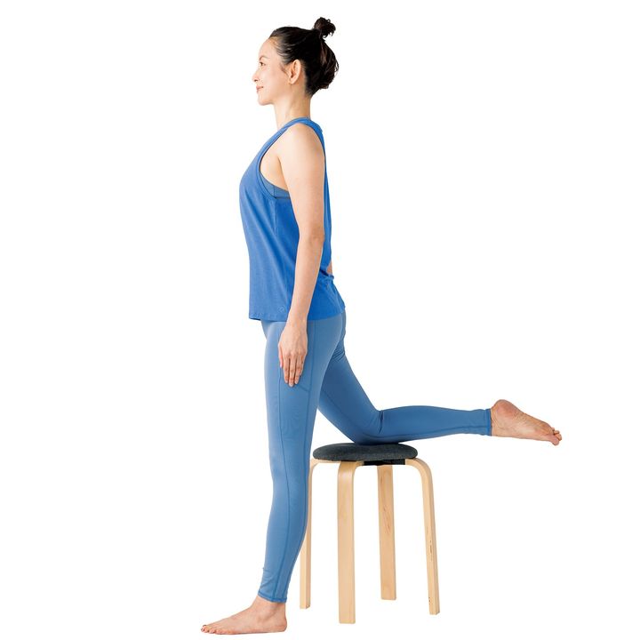 ①椅子を足の長さ分前方に離して置き、右足をのせる。背中が丸くならないよう、膝をしっかり伸ばし、足首を反らす。