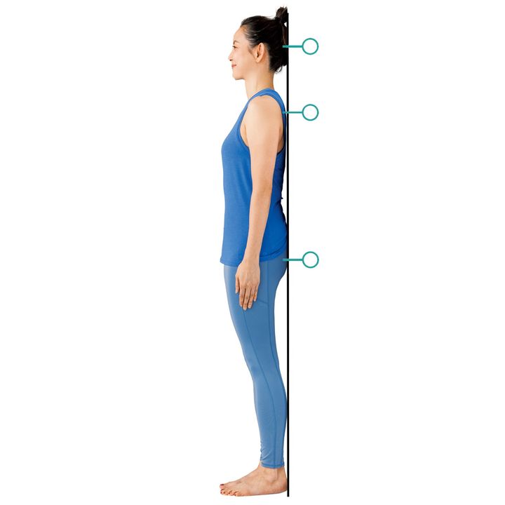 背中が硬いと痩せられません! 背中が柔らかい人は後頭部、両肩、お尻の3点がしっかり壁につきます。ストレッチ前にチェックを。