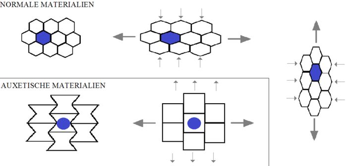 しかし負のポアソン比では、圧縮されると横方向に縮み、引っ張られると横方向に広がる特性があります。
