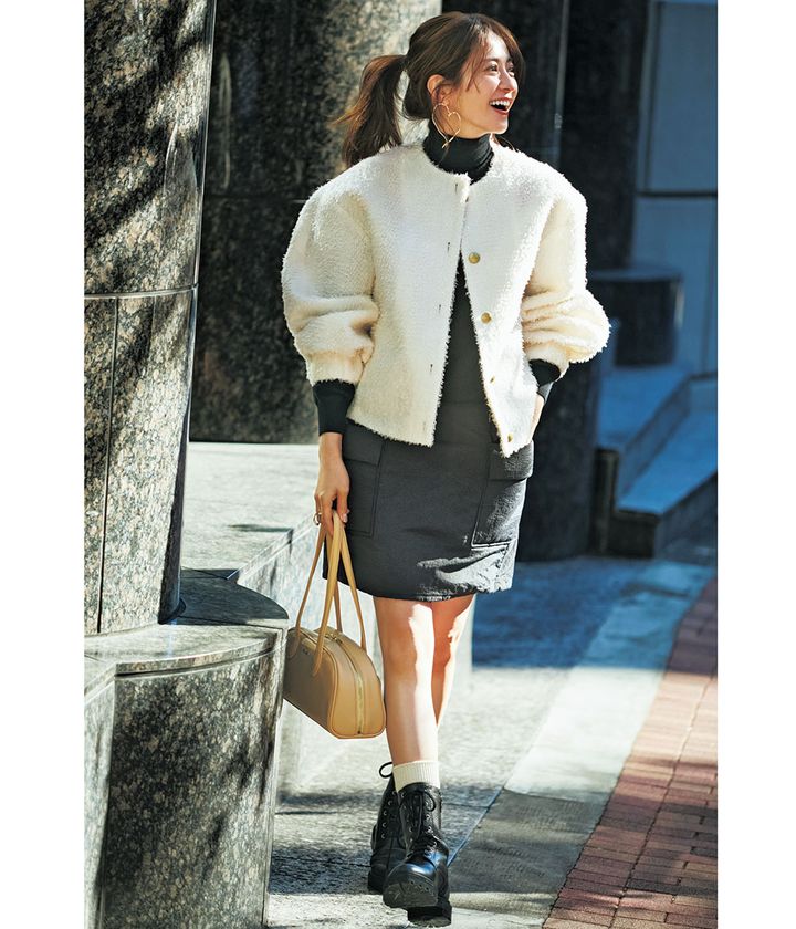 44歳までは、ふわもこ素材で盛り上げて。長いロングスカートブームを経て、ミニスカベースの新バランスに大注目。最愛ふわもこはトレンドのワークブーツで今っぽく。(スタイリスト・石毛のりえさん)