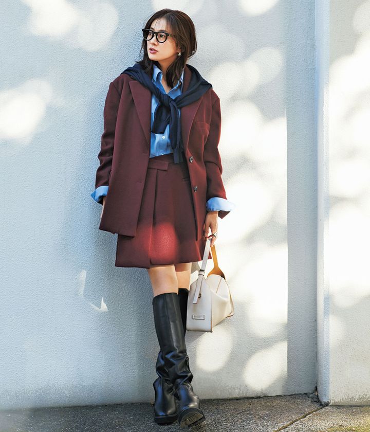 スカート¥18,700ジャケット¥29,700(ともにマイストラーダ/マイストラーダ プレスルーム)シャツ¥28,600(カデュネ/カデュネ プレスルーム)ニット¥27,500(スローン/ザ ショップ スローン 新静岡セノバ店)バッグ¥64,900(ジャンニ キアリーニ/ジャンニ キアリーニ 銀座店)ブーツ¥49,500(銀座かねまつ/銀座かねまつ6丁目本店)メガネ¥66,000(アイヴァン 7285/アイヴァン 7285 トウキョウ)ピアス¥11,550(ココシュニック オンキッチュ/ココシュニック)リング¥62,700(マリハ)