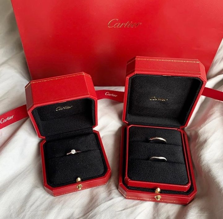 風由子さん:はい、婚約指輪はCartier(カルティエ)のソリテール1895です。4本爪のバスケットセッティングのダイヤモンド一粒石のリング。やはり、プロポーズでのCartier(カルティエ)の赤いボックスはあこがれでした。