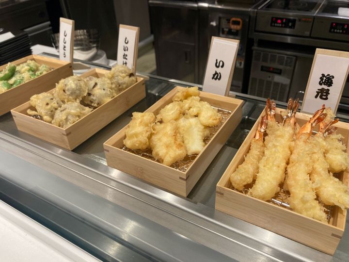 ライブキッチンで次々に揚げてくれる天ぷらも目を引きます。衣がサクサクで油切れもよく、朝からぜいたくな気分。