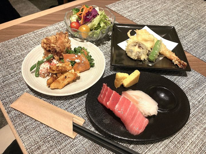 目移りしながら1ターン目の料理をセレクト。まず、にぎり寿司は欠かせません! 何度食べでもいいので、お腹に余裕があればおかわりしたいところ。揚げたての天ぷらも食べたいし、ヘルシーにサラダやデリのほか、ザンギなどのホットメニューもひと口ずつ食べられるのがビュッフェの嬉しいところ。