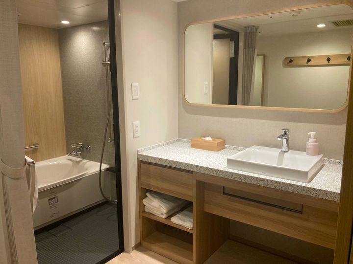 洗面スペースとバスルームもプレミアムルームならではのこの広さ。洗面ボウル以外の洗面台に余裕があるので、洗面グッズを置いておきやすいですし、鏡もワイドで大きいのが使いやすいです。