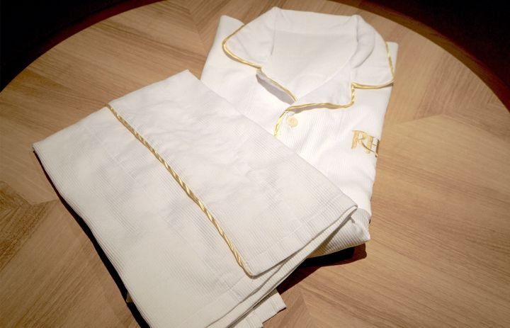 ナイトウェアは前開きのワンピースタイプになっています。綿素材のシンプルなデザインですが、リッチモンドホテルズのロゴとパイピングのゴールドが素敵なアクセントになっています。