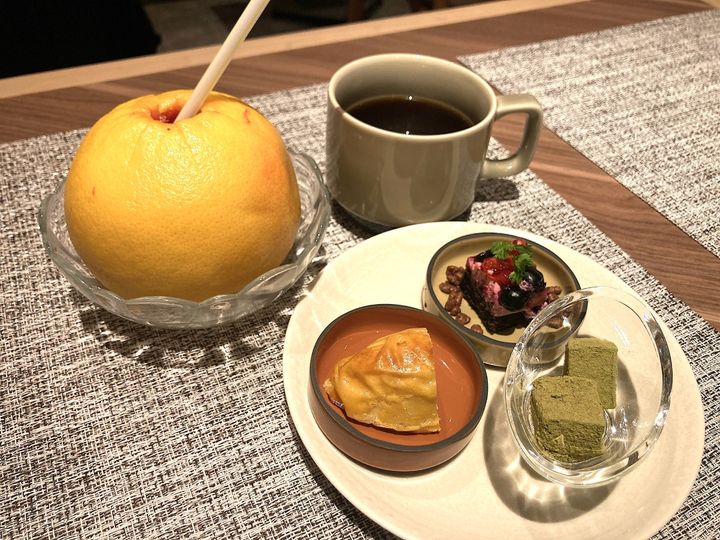 食後にはドリンクとともにスイーツを。グレープフルーツをまるごと絞ったジュースも、このビュッフェでひときわ目を引くメニューの一つです。