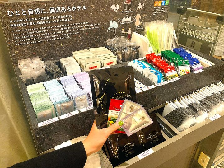 チェックインを済ませたら、フロントそばに備えられたアメニティコーナーから、必要なアメニティを選びます。歯ブラシやヘアブラシなど基本的なアメニティのほか、小分けのスキンケアアイテム、フェイスパックなども揃っています。香りの異なる3種類の入浴剤も嬉しいラインナップ。バスタイムが楽しみになりますね。