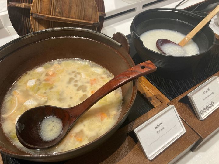前夜飲みすぎてしまった人には、優しい味わいのメニューもあります。北海道ならではの鮭が入った石狩鍋の味噌汁とホタテのおかゆは、見た目の派手さはありませんが、心から温まる品々。魚介のうま味が体に染みわたります。