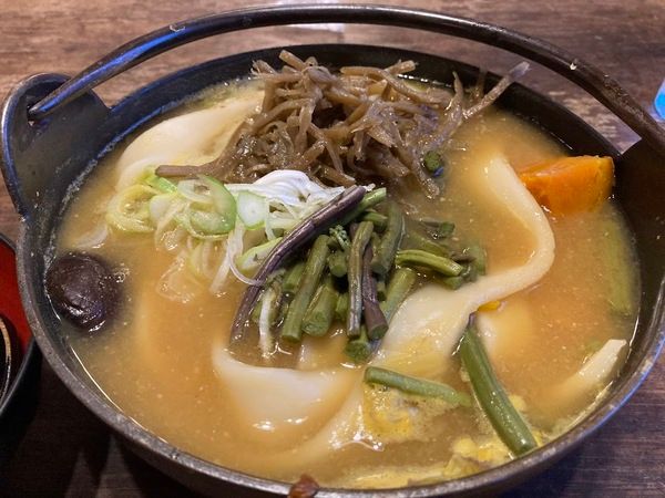 美味しそうなかぼちゃが顔を出しているのもいい感じですし、平打ちの太いほうとうの麺も迫力です。上には山菜、ネギ、ごぼう、しいたけなどなど、お野菜がたっぷり。