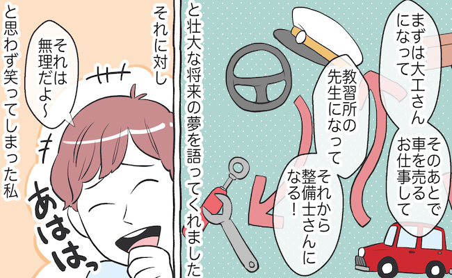 「パパとママが新しい家に住めるように大工さんになって僕が家を建てて、かっこいい車に乗ってほしいから車屋さんになって僕が選ぶ。弟に車の免許をとらせてあげたいから教習所の先生になる。整備士になるのは最後でいいよ」と長男は答えました。自分がなりたい整備士を差しおいてでも、私たち家族のためを思って考えてくれていたことを知り、私は笑ってしまったことをとても後悔しました。