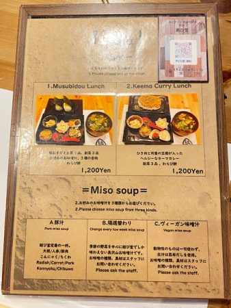 結び堂ランチ(1200円)とキーマカレーランチ(1200円)があります。 私は初来店ですので定番のおにぎりの付いている結び堂ランチにしました。
