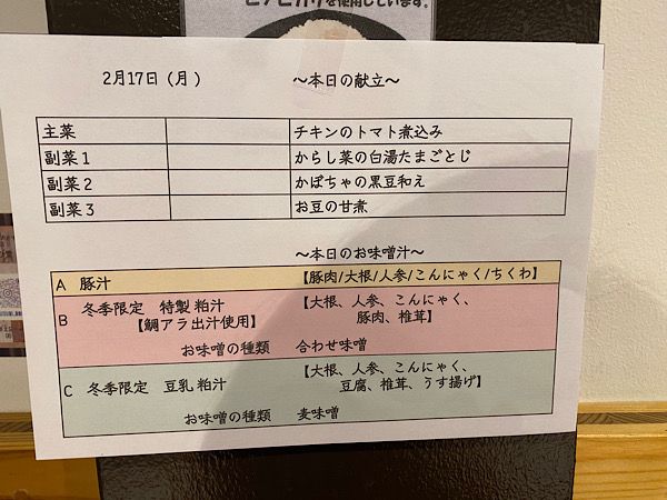 その日の献立が壁に掲示されています。 本日のお味噌汁は3種類。豚汁・粕汁・豆乳粕汁から選びます。私は大大好きな粕汁にしました。