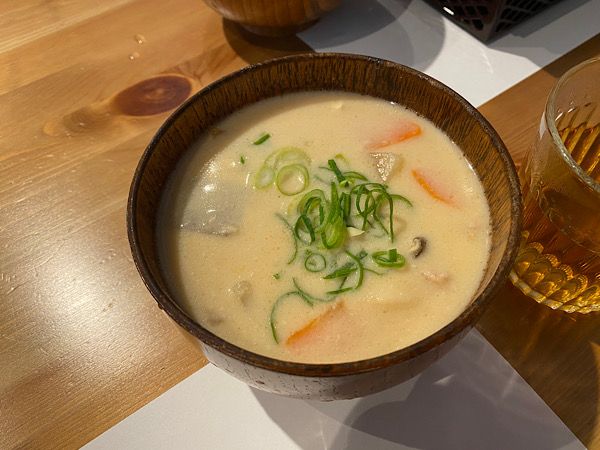 感動は特製粕汁。鯛アラ出汁がベースです。具がたっぷり入っています。お椀はかなり大きめで飲みごたえがあります。体がポカポカと温まりました。