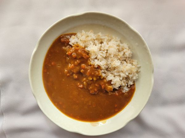 野菜の甘い香りとやさしい色味に「甘めのカレーかな?」と想像して一口。甘めと思っていた分、衝撃のスパイシーさでした。十数種類使われているスパイスの複雑な味わいは、辛いだけではなく後を引くおいしさ。この爽快感は、これから暑くなる季節にもよさそうです。お好みの具材を加えるとさらにおいしさが際立つそう。