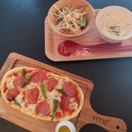 こちらはサラダ&スープセットでのサラミ&アスパラのピザ。スープは豆乳をベースにしたやさしくコクを感じるスープでピザのおいしさを引き立てるものでした。