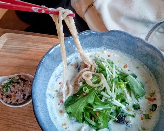 伊達寺巣そばとは麵が違います。こちらは玄米麵です。※米粉麵と玄米麵から選択可能 玄米だから麵の色が赤っぽいですね。豆乳スープがやさしい味わいでこちらもおいしかったです。