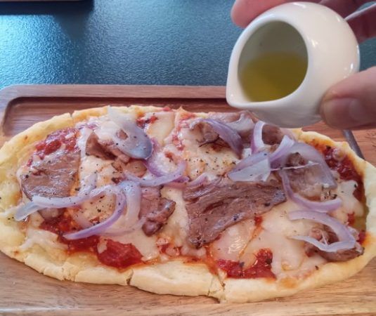 福島牛&紫たまねぎのピザを注文。お好みでオリーブオイルをかけていただきます。