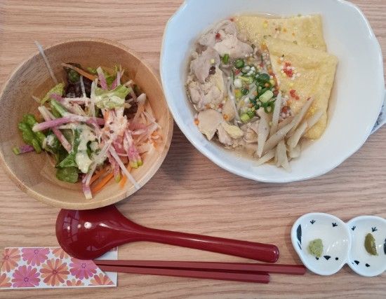 こちらは豆乳寺巣そばです。きずな結びは左側に見えるレンゲに盛られたご飯です。