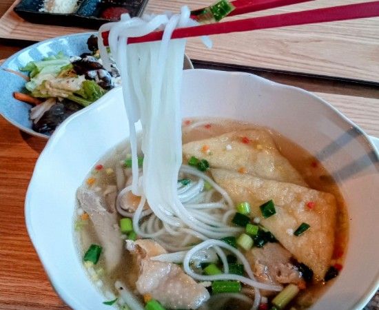 麵が白いんです。この白さに、「あ~お米の麺だ」と改めて思いましたね…。つるつるっとしてておいしく、スープとよく合いました。