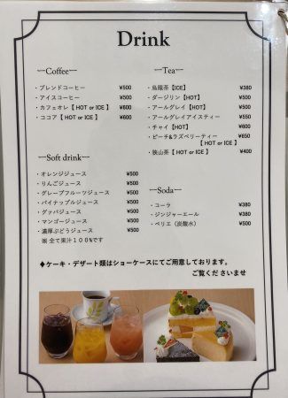 お食事系のセットメニュー、サラダ、ドリンク付き、デザートも100円引きでつけることもできます。また単品でも。サラダ、スープ、ドリンク等単品でもあります。