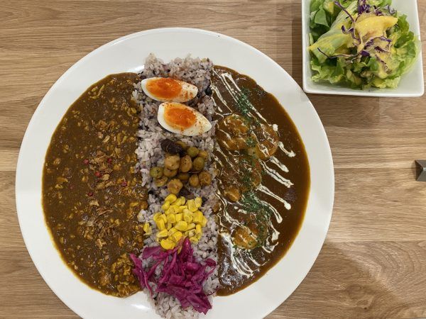 鶏ももひき肉のカレーはスパイシー程よい辛さ、小海老のカレーはクリーミーな甘口。ちょうど違った味で嬉しい。あっち食べたり、こっち食べたり、混ぜ合わせて食べたり。トッピングも楽しい!