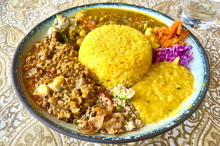 紫キャベツのコールスローはマヨネーズと絡めていて懐かしい味だ。ちりめんじゃこと玉ねぎ、青唐辛子の炒め物は食感と辛味でいい刺激になる。クスクスは優しい香りで大量に食べたくなる味わい。