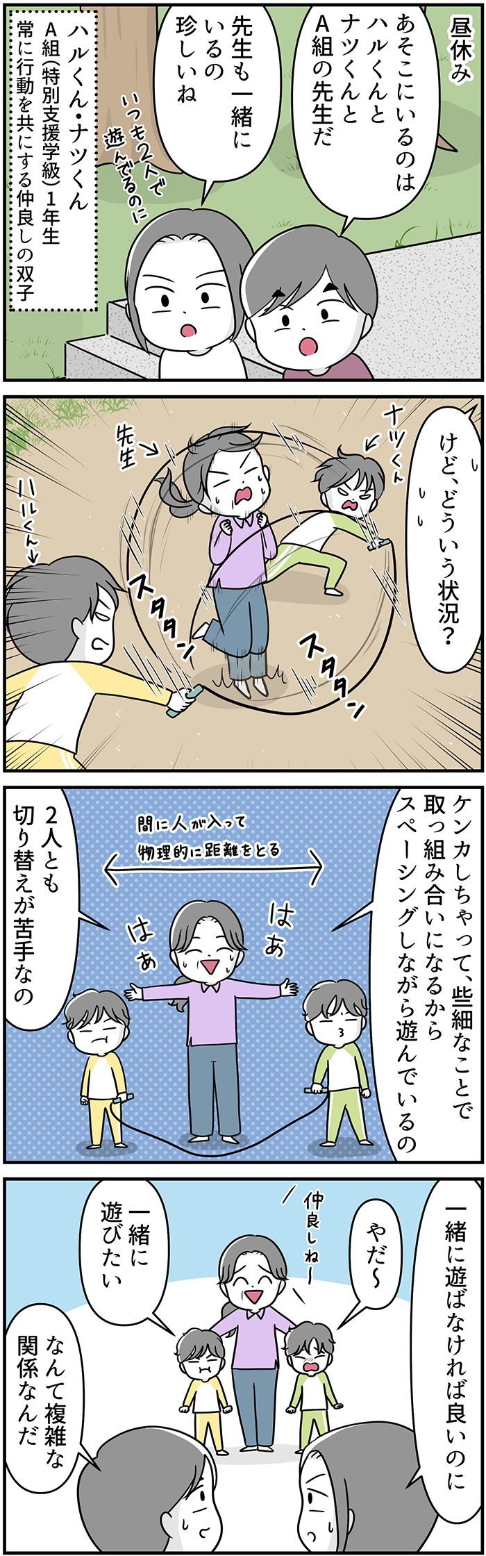 ASD(自閉症スペクトラム)の小学生・スバルくんのカラフルな日常を描きます。今回は特別支援学級でとなりの組の双子、ハルくんとナツくんについてです