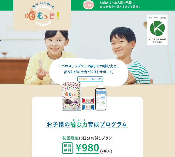 「噛もっと!」は、ライオンがはじめた0〜12歳までのオーラルヘルスケアプログラム「おくち育」のひとつで、4~12歳の歯の生え変わり期に噛む力を育むための専用グミと、月に1回噛む力をチェックするためのガムがセットになっています。