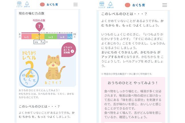 レベル2のねこタイプと判定されて、猫好きな息子はちょっとうれしそう。レベルがアップするとしろくまタイプなど噛む力が強い動物が出てくるようなので、そこを目指してくれ〜! と思わずツッコミましたが、子どもがゲーム感覚でできて続けるモチベーションにつながりそう。
