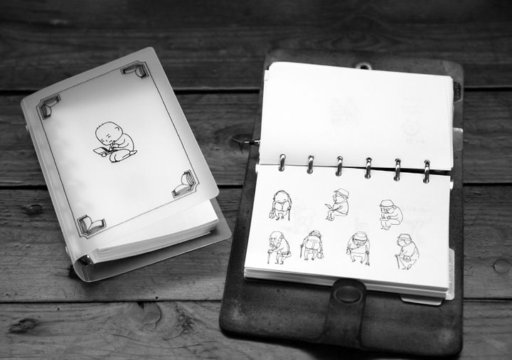 スケッチです。人に見せることは考えず、このM6の手帳に自分を救うためだけに描いてきました。ノルマにしているわけではなくて、1か月間何も描かない日もあります。家族とケンカしたり、やらなきゃいけないことが山積みだったり、ストレスを感じた時の逃げ場として描いてきました。気持ちが落ち込みがちなので、描きながら、「こんな楽しいこともあるじゃないか」と自分を盛り上げるための福利厚生みたいなもの(笑)。絵本のネタになることも多々ありますが、この先仕事がなくなっても精神衛生上、日常の必要な作業として、この小さな絵は描き続けると思います。何もできなかった日も、「できなかった」という顔を描くと仕事した感を持てますしね!