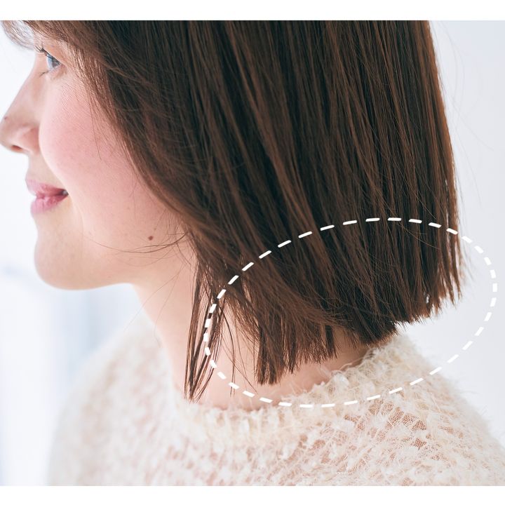 アゴ下3cmくらいのワンレングスベースにし、前髪を目くらいの長さでカット。全体を短めに切ってレイヤーをほとんど入れないことで、毛先にまとまりが出て厚みが強調できます。全体の根元を潰すように乾かしたら、全体にざっくりとストレートアイロンを通します。