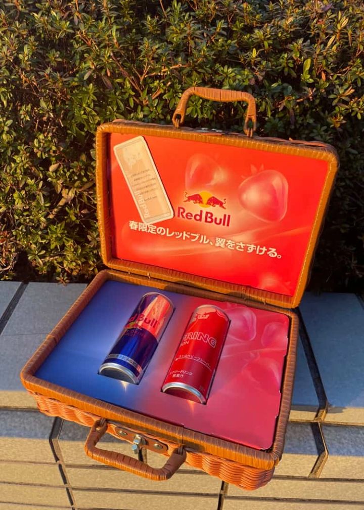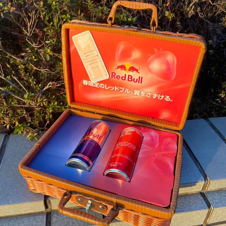 ナチュラルなバスケット風ギフトBOXのなかには、春らしいストロベリーフレーバーのレッドブルが…!見た目からテンション上がる♡