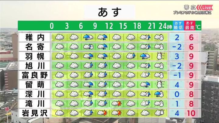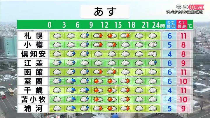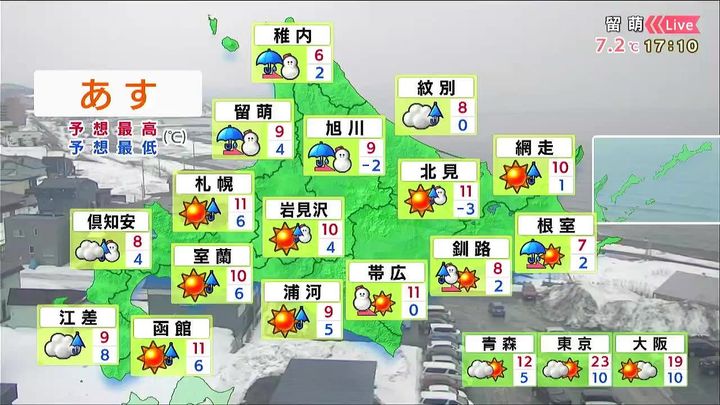 朝は雨、日中晴れて夜は雪と変わりやすいでしょう。朝から気温は高く、札幌の最低気温はプラス6度です。なだれや泥はねなどに引き続き注意して下さい。