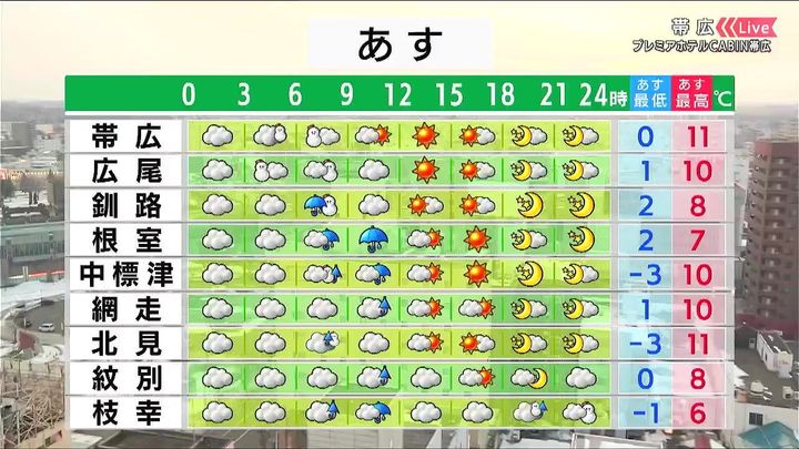 朝は広く雨ですが、十勝地方では雪でうっすら積もるでしょう。午後は天気が回復し晴れます。枝幸は夜は雪に変わるでしょう。