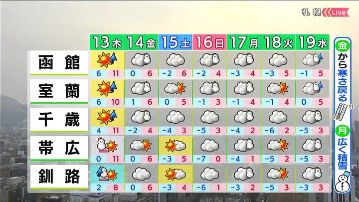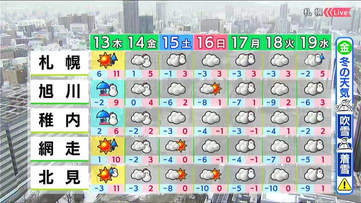 14日(金)は冬の天気が戻ってきます。湿った雪で、山沿いで雪の量が多くなるおそれがあります。また海岸部はふぶくでしょう。15日(土)も札幌で雪が降りますが、16日(日)は割合穏やかです。