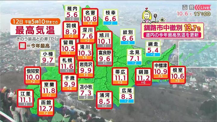 ※12日午後5時時点の情報です。最新の気象情報は、HBCウェザーセンターのホームページなどでご確認ください。HBCは気象庁の認可を2001年に得て以来、民間気象会社の一つとして「HBCの独自予報」を発信しています。