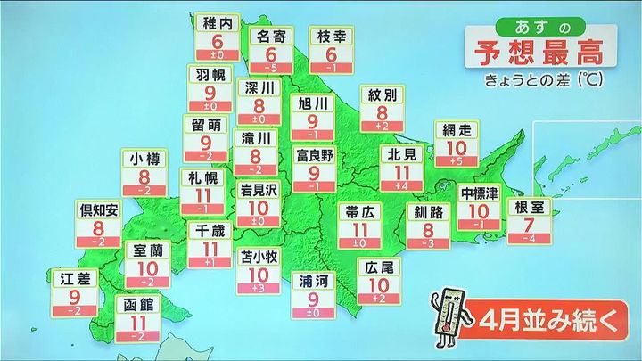 札幌や北見で11度など10度前後のところが多くなります。オホーツク海側できょうより高くなります。その他は、きょうほどではないですが、4月並みの気温が続くでしょう。