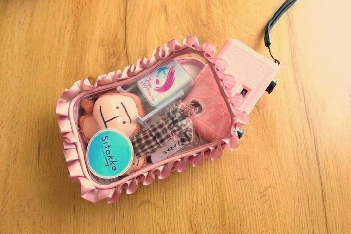 こんな具合に収まりました。かわいい〜!フリルが効いてるでしょ?頑張れば、小型の双眼鏡も入るんです。