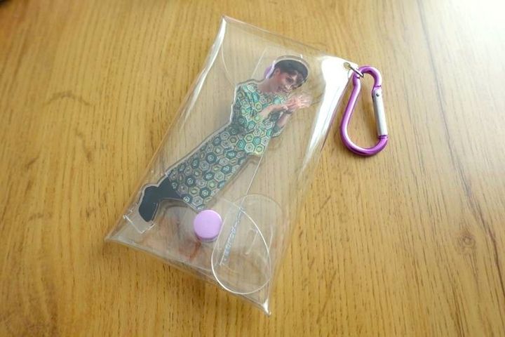 推し活には基本のアイテム、アクスタケースです。頑丈なカラビナも付いてるから、どこへ行くにも一緒。