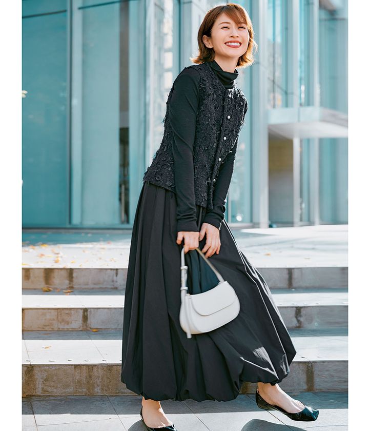シンプルなシャツやニットに重ねるだけで一気に華やぐツイードジレは、イイものに投資したい派が続出。スタイリストさん達も大絶賛のマディソンブルーはブラック×ネイビーのほぼクロ配色が大人! こんなドラマチックなバルーンスカートも甘さマイナスで攻略できます。