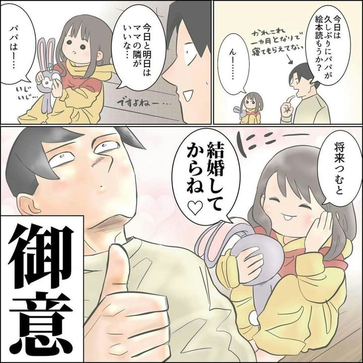 パパ目線で娘2人との日常漫画を描いているゆーぱぱ(@yuupapa.ikuji04)さん。子どもたちとの生活には、幸せな瞬間がいくどとなく訪れます。その瞬間を記憶に焼き付けようと、たくさんの幸せな瞬間を切り取り、描かれた作品です。日常生活のいたるところで娘たちの尊さを噛みしめているゆーぱぱさん。疲れている日も、子どもの一言で疲れが吹っ飛んでなくなったり、帰宅すると笑顔で出迎えてくれたり、愛おしい瞬間で溢れています。『幸せまとめ』をごらんください