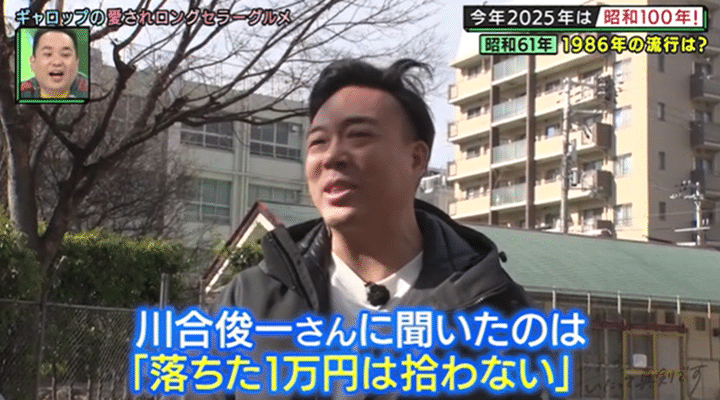 毛利が元バレーボール全日本男子代表・川合俊一から聞いた話によると、当時は「落ちた1万札は拾わない」のだそう 。それに対して林は「うわ~、落としたら呼んでくれよ!」と笑いを誘った。さらに毛利は「1万札ではタクシーが止まらないから札を広げてタクシーを止めていた」とバブル時代のエピソードを続けた。