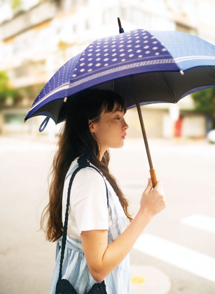 〈WMV〉で見つけた日傘は、綿と絹で織り上げたオリジナルのバンダナ柄をプリントしたシャンブレー生地が印象的。職人の手で一つ一つ丁寧に製作されたもので、桜の木を使用した傘の柄は、女性の手に馴染むようにと斜めにカットした、持ちやすさも特徴。日差しの強い台湾を訪れるなら、やっぱり気になるのが紫外線。こんな日傘があれば、街歩きがもっと楽しくなる。日傘¥174,240、ショルダーバッグ¥140,800(ともにWMV /ダブリュー エム ブイビズビム トウキョウ 03‒6303‒3717)ワンピースは2で紹介。その他スタイリスト私物