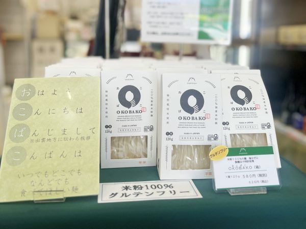 お店オリジナルの商品もあるんですよ。1つ目は、米粉100%で作られた塩分も入っていない「OKOBAKO(おこばこ)」です。その製麺法は、特許も取得済で、日本にはなかなかないお米の麺です。