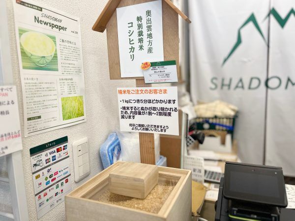 減農薬・減化学肥料・特別栽培米のコシヒカリ「深山の清水米」は、もみのままお店に届き、お客さんの注文を受けてから精米しています。好みに応じて、精米具合も調整してくれるそう!精米したての美味しさは格別なので、これはうれしいサービスです。