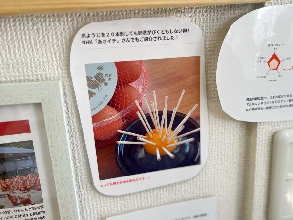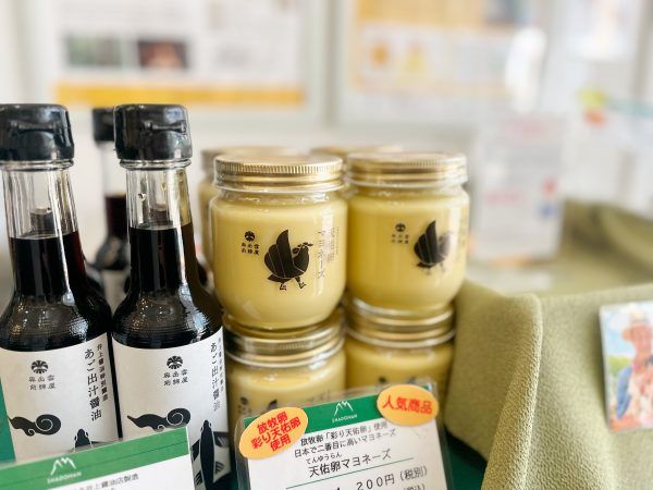 あまり島根に馴染みのない私は、店内の商品ほとんどが目新しいものばかり!その中でも、今回のお目当ては、NHKのアサイチでも紹介されたという平飼で育てられた放牧卵「彩り天佑卵」です。栄養たっぷりで安心・安全!奥出雲の自然の中でストレスなく育てられたニワトリが産んだ卵なのだとか。